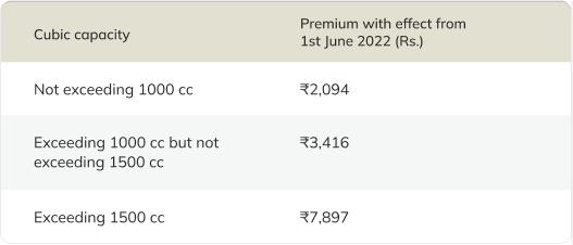 Third-party liability premium – this is stipulated by the Insurance Regulatory and Development Authority of India (IRDAI), and it is directly proportional to your car’s cubic capacity.